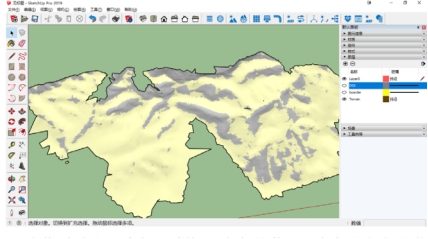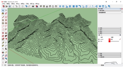 第一步:導(dǎo)入等高線地圖。將處理過的平面等高線地形圖輸入SketchUp可以生成相應(yīng)的3D山地等高線地形圖。如圖1草圖大師生成的3D山地等高線地形圖。設(shè)計師此時在軟件界面上就可以更直觀的對設(shè)計對象的地形地貌有一個全面的了解。為了更加的直觀和真實,下一步會將等高線圖轉(zhuǎn)化為山體的表面。
