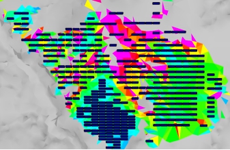 第四步:輔助分析布置間距。此時的山體被“解析”成了許多三角形,軟件會根據(jù)預(yù)設(shè)的擬布置方陣尺寸和傾角對每一個“三角形”進(jìn)行分析計算,得到適合的布置間距。軟件對三角面的解析以及一些其他的分析計算量特別大,越復(fù)雜的山體對計算機(jī)的配置要求越較高。建議采用有獨(dú)立的顯卡的計算機(jī),內(nèi)存建議16G。