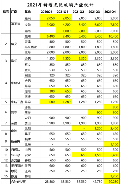 2021年是光伏玻璃產(chǎn)能投放的大年,光伏玻璃將會經(jīng)歷緊缺、結(jié)構(gòu)性緊缺、和全面滿足需求的階段。下面這張表格是我分季度統(tǒng)計(jì)的各家明年新增產(chǎn)能情況,其中標(biāo)黃的位置代表產(chǎn)能發(fā)生變化的時間節(jié)點(diǎn):