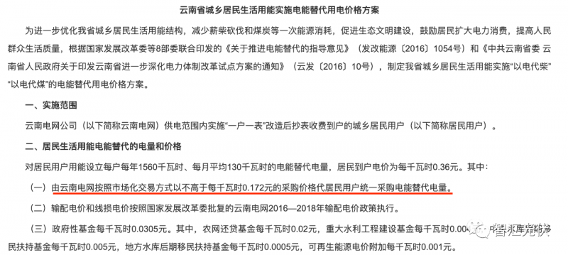 根據(jù)云南省人民政府2016年7月29日下發(fā)的《云南省城鄉(xiāng)居民生活用能實(shí)施電能替代用電價格方案的通知》,豐水期執(zhí)行的是不高于0.172元/kWh的統(tǒng)購價格!