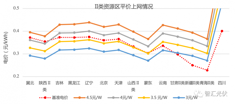 甘肅省3.5元/W時的反算電價基本與基準(zhǔn)電價相同;說明在3.5元/W及以下的造價時,甘肅省基本可以以煤電價格實現(xiàn)8%的收益;