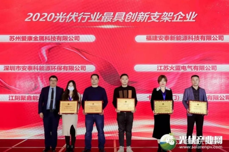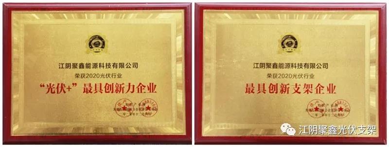 江陰聚鑫能源科技有限公司在此次評(píng)選中榮獲「PV TOP 50」“2020光伏行業(yè)最具創(chuàng)新支架企業(yè)”、“2020“光伏+”最具創(chuàng)新力企業(yè)(BIPV)”2個(gè)創(chuàng)新獎(jiǎng)項(xiàng)。
