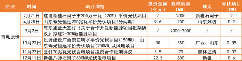 據(jù)統(tǒng)計(jì),吉電股份此前與眾多企業(yè)簽約,頻繁擬投建光伏項(xiàng)目,目前已達(dá)成6個(gè)項(xiàng)目的建設(shè)協(xié)議,光伏項(xiàng)目規(guī)模約3.22GW。具體詳情如下: