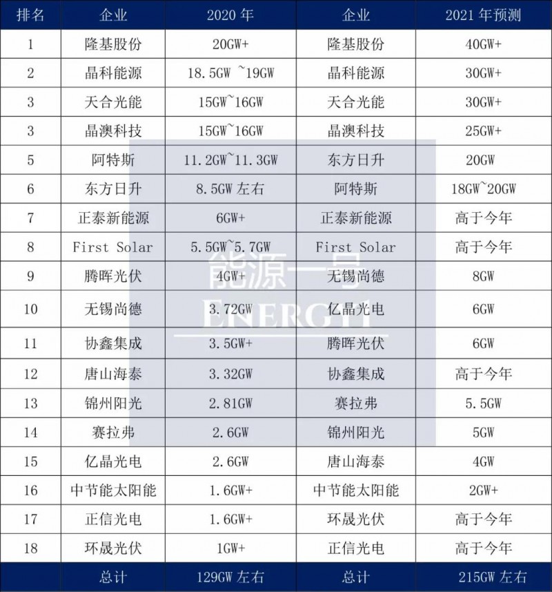 結(jié)合市場調(diào)研、各方詢問及統(tǒng)計,全球首發(fā)這張集合全球核心廠商的組件出貨量榜單,以求更客觀、更具體、更立體地呈現(xiàn)下游產(chǎn)業(yè)的全貌。榜單中可以看到,今年這些企業(yè)的總出貨約129GW,2021年的出貨量預(yù)計高達215GW。