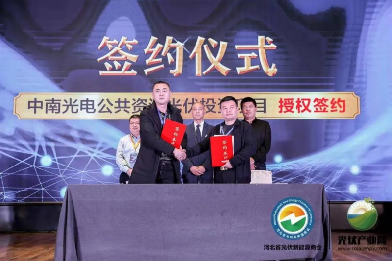 論壇現(xiàn)場還舉行了中南光電公共資源光伏投資項目授權(quán)簽約儀式,中南光電公司代表與5家縣域經(jīng)銷商舉行簽約。