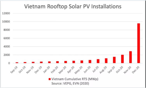 圖片:2019年9月至2020年12月,越南屋頂光伏累積裝機(jī)容量柱狀圖