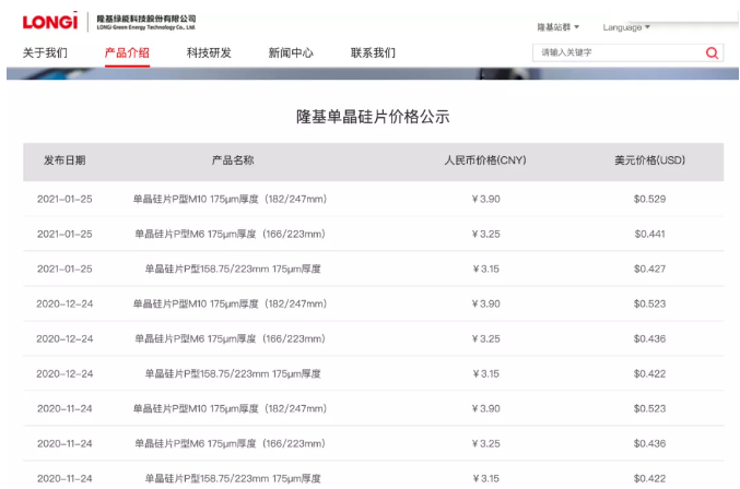 1月25日,隆基股份發(fā)布新一期硅片價格公示。