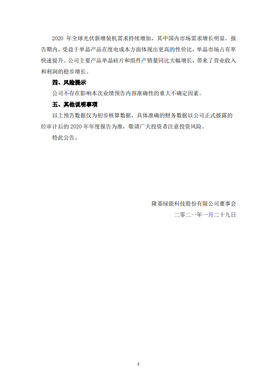 公告稱,2020年業(yè)績(jī)預(yù)增的主要原因是2020年全球光伏新增裝機(jī)需求持續(xù)增加,其中國(guó)內(nèi)市場(chǎng)需求增長(zhǎng)明顯。受益于單晶產(chǎn)品在度電成本方面體現(xiàn)出更高的性價(jià)比,單晶市場(chǎng)占有率快速提升。公司主要產(chǎn)品單晶硅片和組件產(chǎn)銷量同比大幅增長(zhǎng),帶來了營(yíng)業(yè)收入和利潤(rùn)的穩(wěn)步增長(zhǎng)。