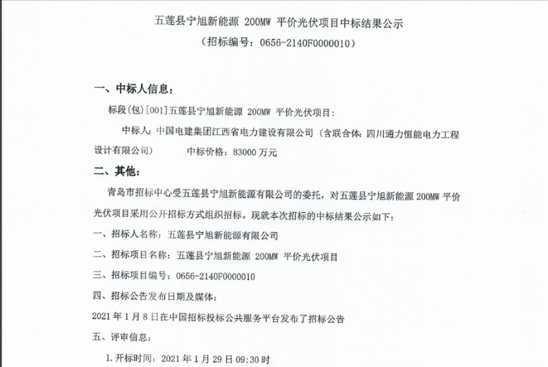 根據(jù)招標公告,該項目建設(shè)于五蓮縣于里鎮(zhèn)、汪湖鎮(zhèn)境內(nèi),采取EPC總承包的模式,建設(shè)規(guī)模為200MW。包括光伏電站太陽能電池至并網(wǎng)點的全部工程設(shè)計、設(shè)備材料采購(含光伏組件)、建筑工程施工以及工程管理、驗收等。計劃工期為2021年12月30日前具備全容量并網(wǎng)條件。