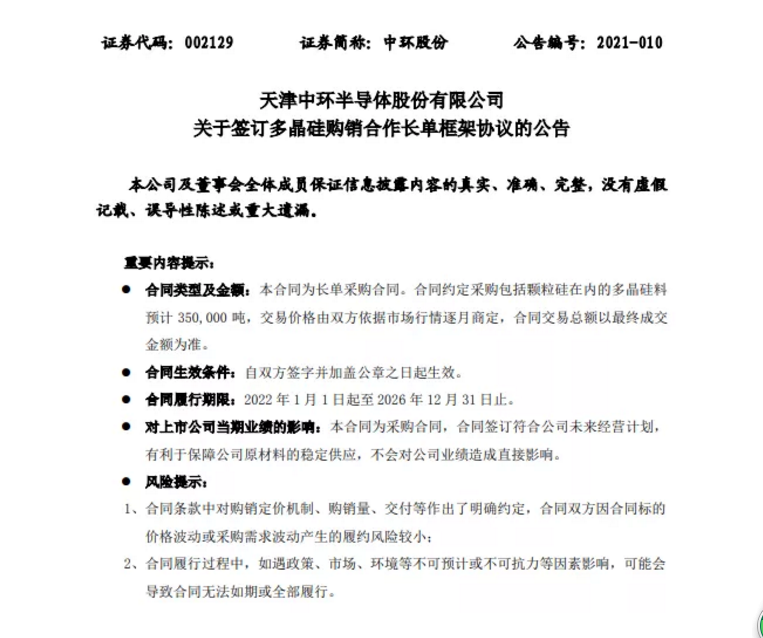 2月2日,隆基股份發(fā)布公告,未來(lái)三年(2021-2023)擬向保利協(xié)鑫旗下子公司江蘇中能采購(gòu)多晶硅9.14萬(wàn)噸。按照當(dāng)前成交價(jià),該合同總金額約73.28億元人民幣(不含稅)。合同總金額占公司2019年度經(jīng)審計(jì)營(yíng)業(yè)成本的約31.33%,年均合同金額占公司 2019年度經(jīng)審計(jì)營(yíng)業(yè)成本的約10.44%(本測(cè)算不構(gòu)成價(jià)格承諾)。