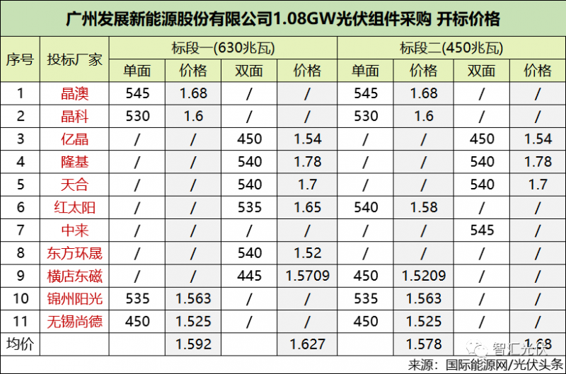 而在昨天開標(biāo)的廣州發(fā)展1.08GW的組件招標(biāo)中,最低報(bào)價(jià)為東方環(huán)晟(中環(huán)股份下屬組件企業(yè))的1.52元/W,最高報(bào)價(jià)已經(jīng)到1.78元/W。如下表所示。