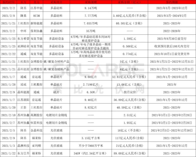 硅片方面,通威與京運(yùn)通、上機(jī)數(shù)控累計(jì)簽訂單晶硅片訂單超12億片;晶科能源向通威采購硅片6.5GW;江蘇潤陽向京運(yùn)通采購硅片9.46億片;正泰向上機(jī)數(shù)控采購單晶硅片8.82億片,以上合同采購期限均為2021-2023年。同時(shí),蘇州協(xié)鑫與高測股份、恒星科技簽訂總價(jià)4.46億元的電鍍切片金剛線采購項(xiàng)目。