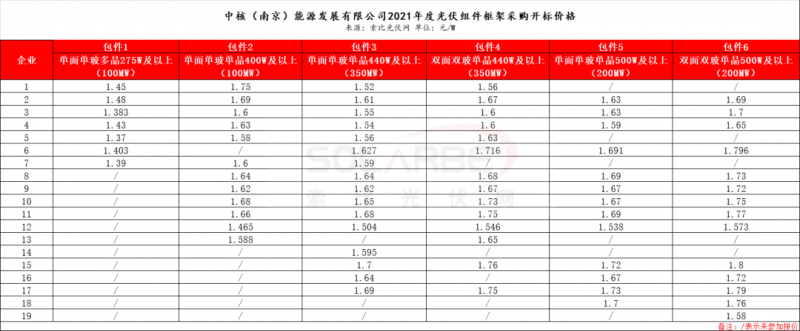 1月20日,中核匯能2021年度光伏組件設(shè)備第一次集中采購公布中標(biāo)候選人,組件交貨期2021年1月至9月。其中,單晶445/450W投標(biāo)價格在1.48~1.54元/W;單晶535/540W投標(biāo)價格在1.52~1.66元/W;單晶雙面535/540W投標(biāo)價格在1.647~1.701元/W。