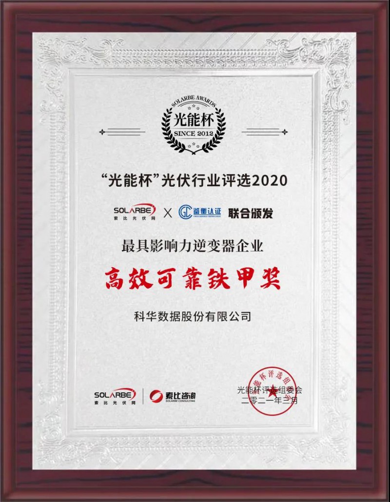 3月3日,2020“光能杯”跨年分享會(huì)在蘇州舉辦,在“光能杯”頒獎(jiǎng)典禮上,科華憑借逆變器產(chǎn)品的安全可靠、高效智能等卓越品質(zhì),榮獲Solarbe和鑒衡認(rèn)證聯(lián)合頒發(fā)的最具影響力逆變器企業(yè)之高效可靠鐵甲獎(jiǎng)。