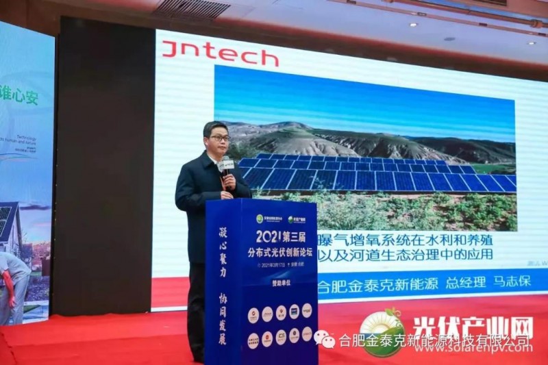 合肥金泰克新能源總經(jīng)理馬志保做了主題為《光伏灌溉和曝氣增氧系統(tǒng)在水利和養(yǎng)殖以及河道生態(tài)治理中的應(yīng)用》的演講,闡述了光伏作為新能源在國(guó)家智慧農(nóng)業(yè)、水利領(lǐng)域、生態(tài)文明建設(shè)和美好鄉(xiāng)村領(lǐng)域的應(yīng)用和推廣價(jià)值,展現(xiàn)了我們研發(fā)的光伏智慧灌溉系統(tǒng)和光伏曝氣增氧系統(tǒng)方案,并分享了我們?cè)谌虻墓夥喔群推貧庠鲅醯膽?yīng)用經(jīng)驗(yàn)。