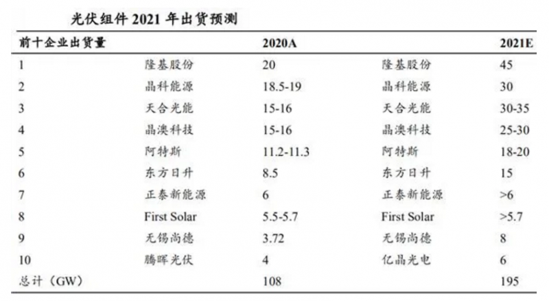 根據(jù)新擴(kuò)產(chǎn)能投產(chǎn)進(jìn)度,測算2021年7家組件企業(yè)出貨量合計(jì)預(yù)計(jì)將超過181GW。預(yù)計(jì)2021年全球光伏新增裝機(jī)約160-170GW,若按1:1.1容配比,對應(yīng)組件需求量約176-187GW。全球前7家組件企業(yè)出貨量將基本滿足全部裝機(jī)需求,龍頭擴(kuò)產(chǎn)升級行業(yè)競爭,2021年組件環(huán)節(jié)競爭將進(jìn)一步發(fā)展為一線組件龍頭之間的競爭。