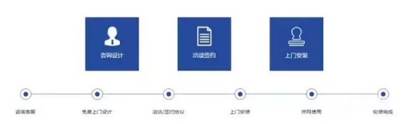 咨詢客服,免費上門設(shè)計,洽談/簽約協(xié)議,上門安裝,并網(wǎng)使用,安裝完成。