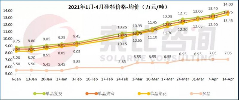 從2月以來的硅料漲勢來看,增長幅度呈現(xiàn)一定規(guī)律,只要多晶料開始上漲,單晶料價格即要邁向下一個臺階。