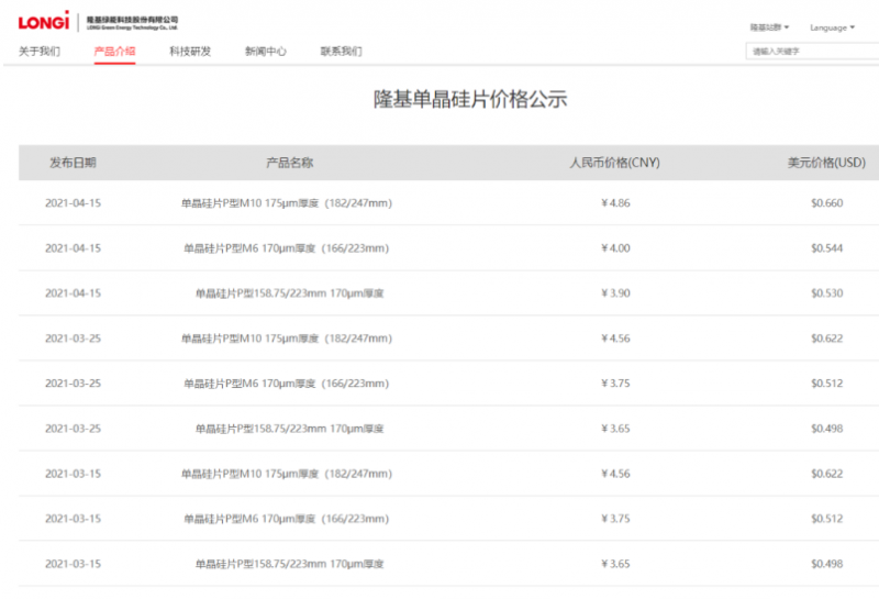 4月15日,隆基官網發(fā)布新一期硅片價格公示。