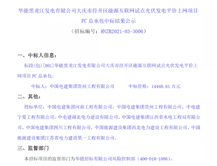 中國電建集團(tuán)貴州工程有限公司中標(biāo),中標(biāo)總價為14440.61萬元,中標(biāo)單價為1.43元/W。