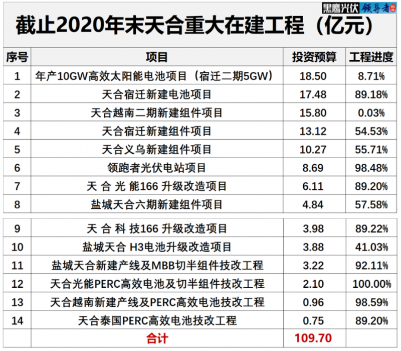 事實(shí)也確實(shí)如此,據(jù)黑鷹光伏統(tǒng)計(jì),截止2020年末天合光能有14大在建工程,總投資預(yù)算達(dá)109.70億元,其中只有一個(gè)是“領(lǐng)跑者光伏電站項(xiàng)目”,其他全部是電池片及組件項(xiàng)目。