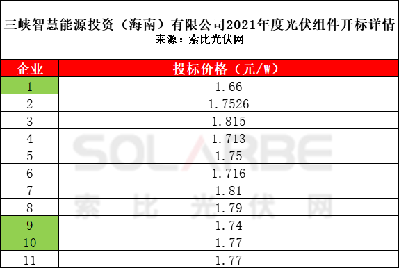 根據(jù)開(kāi)標(biāo)情況,本次招標(biāo)共有11家企業(yè)參與投標(biāo),投標(biāo)價(jià)格在1.66元/W~1.815元/W,最低價(jià)格由一線(xiàn)企業(yè)(下表標(biāo)綠企業(yè))投出。