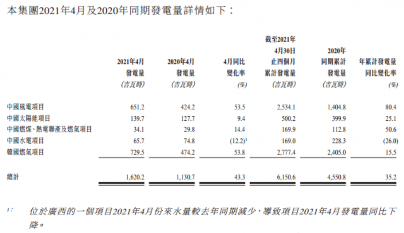 截至2021年4月30日止,1-4月,中廣核新能源累計(jì)完成發(fā)電量6,150.6吉瓦時(shí),比2020年同期增加35.2%。其中,中國(guó)風(fēng)電項(xiàng)目增加80.4%,中國(guó)太陽(yáng)能項(xiàng)目增加25.1%。