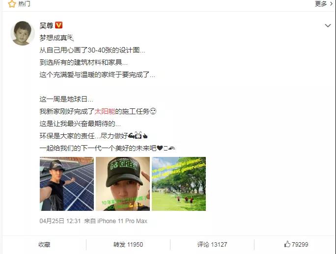 前幾天,明星吳尊發(fā)微博稱(chēng)在自家屋頂安裝了太陽(yáng)能光伏電站,在世界地球日為保護(hù)地球獻(xiàn)一分力: