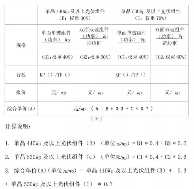 據(jù)悉,本次投標(biāo)采用綜合單價(jià)作為價(jià)格評(píng)分方式,如下圖,綜合單價(jià)(A)(單位元/wp) = 單晶440Wp及以上光伏組件(B) * 0.3 + 單晶530Wp及以上光伏組件(C) * 0.7。