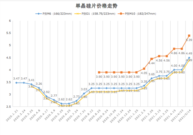 今年以來,多晶硅價格漲幅遠超出行業(yè)預(yù)期,從年初的85元/kg左右的市場均價一路飆漲至當前的190元/kg,漲幅高達123.5%。多晶硅料價格暴漲之下,硅片、組件價格也漲勢迅猛,M6硅片從年初3.25元/片漲至最新的4.49元/片,漲幅達38.2%,組件則普遍上漲0.2~0.3元/瓦,最高價已經(jīng)突破1.9元/瓦。
