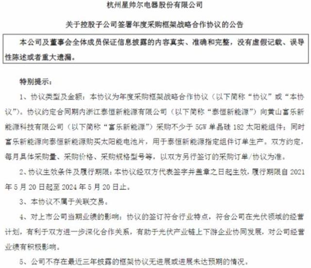 公告中表示,星帥爾控股子公司富樂新能源于2021年5月20日與泰恒新能源簽署了《光伏制造項目戰(zhàn)略合作協(xié)議》,泰恒新能源在合同期內(nèi)向富樂新能源采購不少于5GW的單晶硅182太陽能組件,交易總額以最終成交金額為準(zhǔn)。