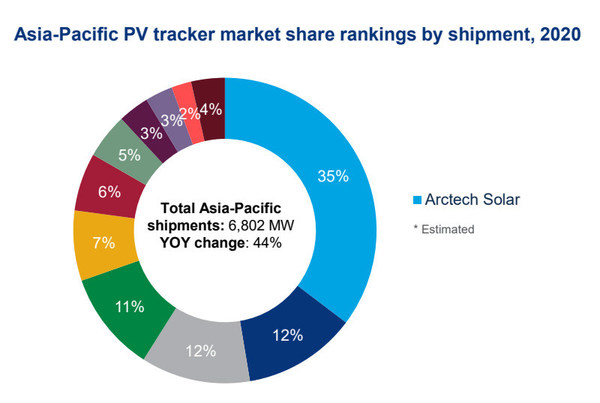 根據(jù)報(bào)告顯示,中信博在亞太地區(qū)已連續(xù)3年保持領(lǐng)導(dǎo)者地位。盡管2020年亞太地區(qū)深受新冠疫情的影響,但亞太的跟蹤市場(chǎng)仍然實(shí)現(xiàn)了44%的增長(zhǎng),出貨量達(dá)到6.8GW,表現(xiàn)出極大的市場(chǎng)潛力。中信博在亞太地區(qū)的市占率也從2019年的24%增至35%,遙遙領(lǐng)先其他競(jìng)品公司。在印度市場(chǎng),2020年中信博與印度大型綜合性集團(tuán)Adani旗下子公司Adani Green Energy簽訂了2個(gè)項(xiàng)目共計(jì)1.7GW的光伏跟蹤系統(tǒng)供貨合同,其中裝機(jī)容量達(dá)860MW的AEML項(xiàng)目,不僅是印度截至目前最大的跟蹤項(xiàng)目,也是印度最大的雙面組件加跟蹤項(xiàng)目。