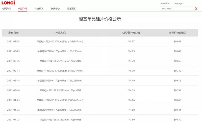 5月14日,隆基股份更新硅片價(jià)格。其中,G1報(bào)價(jià)4.39元/片,較4月23日公示價(jià)格提高0.49元,漲幅為12.56%;M6報(bào)價(jià)4.49元/片,上漲0.49元,漲幅為12.25%;M10報(bào)價(jià)5.39元/片,上漲0.53元,漲幅為10.9。今年以來,隆基股份已5次上調(diào)硅片價(jià)格。