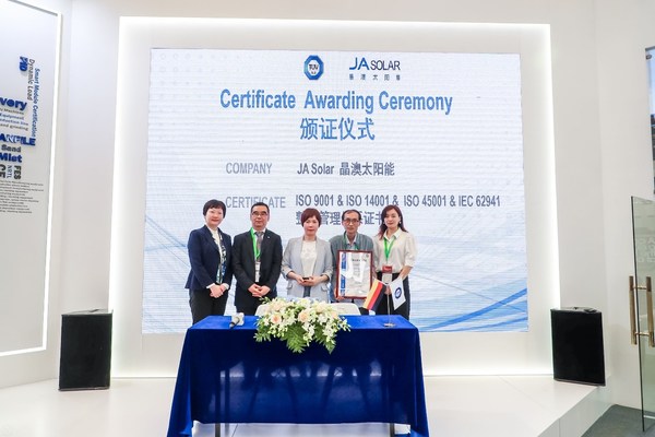 TÜV南德管理服務部總監(jiān)汪微波先生對晶澳同時通過質量、環(huán)境、職業(yè)健康安全和光伏組件制造質量管理體系認證表示祝賀,并為晶澳頒發(fā)了認證證書。汪微波先生同時還表示:“隨著人類社會的飛速發(fā)展,傳統(tǒng)能源探明儲量相對有限,而太陽能的高效開發(fā)和利用,能夠在為社會提供能源的同時極大地改善環(huán)境,推動社會的可持續(xù)發(fā)展。晶澳作為光伏行業(yè)的領軍企業(yè),自創(chuàng)立以來,不斷為社會提供清潔、安全、高效、可持續(xù)發(fā)展的綠色能源,備受國內外客戶的認可。晶澳與TÜV南德合作伊始就非常重視管理體系建設,貫徹ISO 9001、ISO 14001、ISO 45001及IEC 62941等體系標準,對照國際先進管理方法和良好實踐,走出了一條適合自己的體系管理路子,在行業(yè)內具有很好的示范效應。目前TÜV南德已陸續(xù)為晶澳旗下十幾個生產基地頒發(fā)了各種管理體系證書,后續(xù)也將一如既往地為合作伙伴提供專業(yè)的管理體系服務,幫助光伏企業(yè)提高產品核心競爭力。”