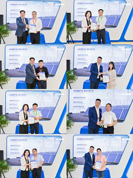 3日上午,TUV北德亞太區(qū)首席執(zhí)行官兼大中華區(qū)董事長任駿先生在TUV北德展臺發(fā)表致辭。隨后,TUV北德先后為橫店集團(tuán)東磁股份有限公司頒發(fā)全球首張光伏組件耐酸性鹽霧認(rèn)證證書,為諾斯曼能源科技(北京)股份有限公司頒發(fā)全球首張漂浮光伏電站用HDPE浮體產(chǎn)品認(rèn)證證書,為四川科陸新能電氣有限公司頒發(fā)2MW儲能PCS安規(guī)認(rèn)證證書,為江蘇日托光伏科技股份有限公司頒發(fā)柔性晶硅光伏組件IEC 61215、IEC 61730認(rèn)證證書,為廣東金源光能股份有限公司頒發(fā)晶硅光伏組件IEC 61215 2021版新標(biāo)準(zhǔn)認(rèn)證證書,為麥田能源有限公司頒發(fā)儲能一體機(jī)意大利并網(wǎng)認(rèn)證證書,為東方日升新能源股份有限公司頒發(fā)光伏組件意大利1級防火證書,為湖南紅太陽新能源科技有限公司頒發(fā)182光伏組件IEC 61215、IEC61730認(rèn)證證書。