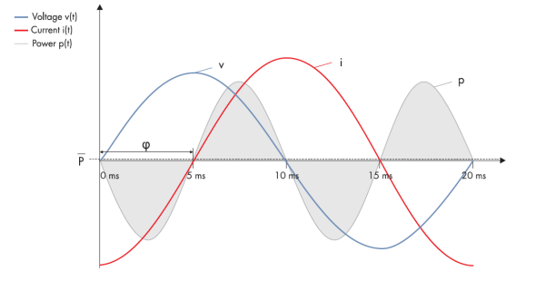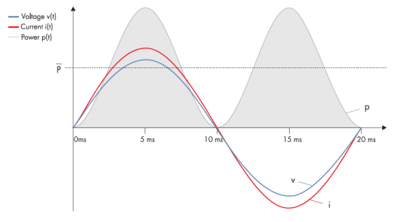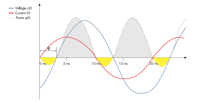 光伏逆變器在成功并網(wǎng)前會(huì)偵測(cè)交流側(cè), 當(dāng)有上圖交流波型后就能并網(wǎng)發(fā)電。不過實(shí)際上偵測(cè)到的電壓及電流不會(huì)在同一瞬間增加及減少,而是會(huì)有一個(gè)時(shí)間差距 – 又稱相位偏移。這是因?yàn)楝F(xiàn)實(shí)生活中的電網(wǎng),從遠(yuǎn)處發(fā)電廠傳輸電力到用戶負(fù)載的線, 會(huì)讓電流或電壓增快或減慢所致。一旦兩者有差距,電網(wǎng)公司就需增加額外能量以滿足終端需求,而這額外增加的部份就是所謂的無功功率, 也就是Q (Var) 。