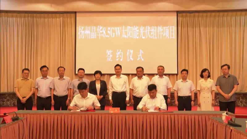 7月19日上午,晶華新能源8.5GW太陽能光伏組件項目簽約儀式在揚州市江都區(qū)人民政府會議中心舉行。江蘇省江都高新技術產(chǎn)業(yè)開發(fā)區(qū)管理委員會書記彭松、晶華新能源董事長金健代表雙方簽約。