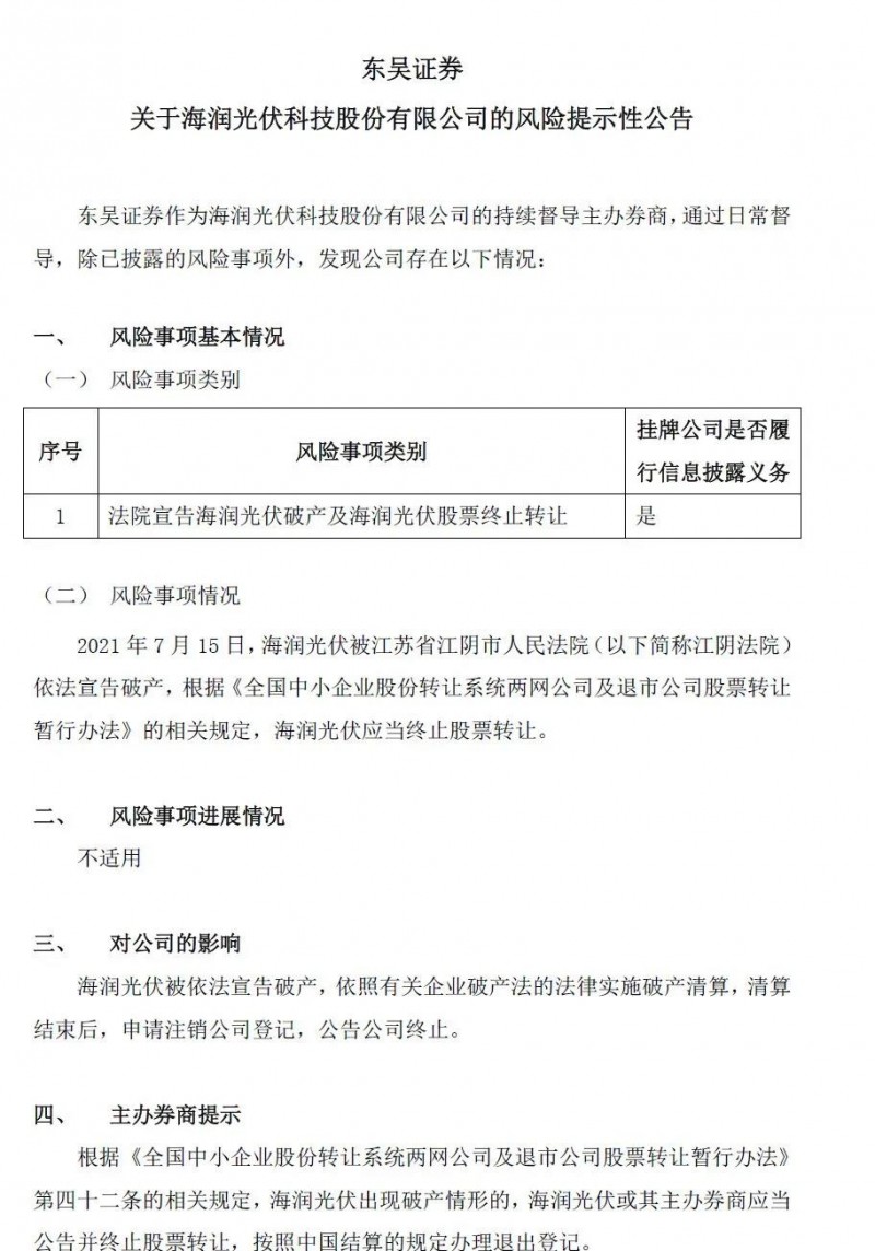 根據(jù)公司公告,江陰法院根據(jù)濰坊匯成新材料科技有限公司的申請,于2021年1月13日裁定受理海潤光伏科技股份有限公司破產(chǎn)清算一案,同日指定了無錫東華律師事務(wù)所為海潤光伏的管理人。