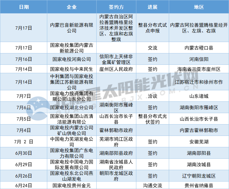 步入七月,國家電投更是連下數(shù)城,在內(nèi)蒙古霍林郭勒市、湖南衡陽市雁峰區(qū)、山東諸城、海南三亞崖州區(qū)、河南信陽以及內(nèi)蒙古阿拉善盟騰格里經(jīng)濟技術(shù)開發(fā)區(qū)整區(qū)、左旗和右旗整旗簽署了整縣分布式光伏開發(fā)協(xié)議,并計劃在內(nèi)蒙古磴口縣進行整縣分布式光伏開發(fā)。