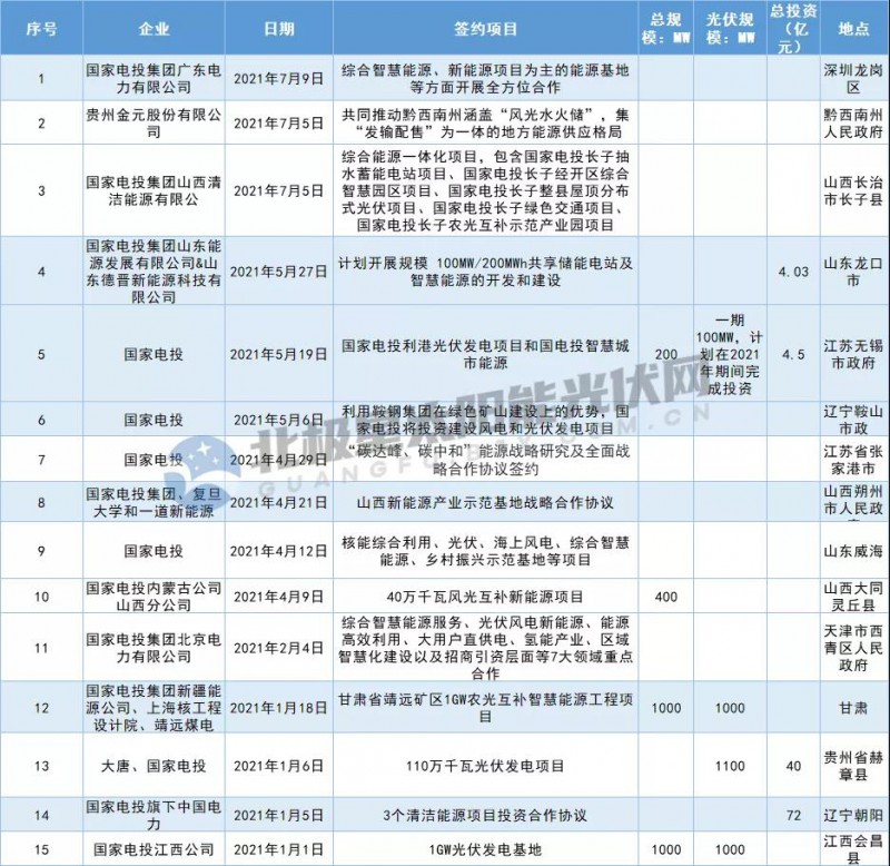 據(jù)北極星太陽能光伏網(wǎng)統(tǒng)計,2021年至今國家電投分別在深圳、貴州、山西、山東、江蘇、遼寧、天津、甘肅、江西等地簽署清潔能源項目投資協(xié)議,涉及風(fēng)光儲、綜合能源服務(wù)、農(nóng)光互補、大基地項目及分布式光伏等多種類型,投資規(guī)模達到GW級,投資金額破百億。
