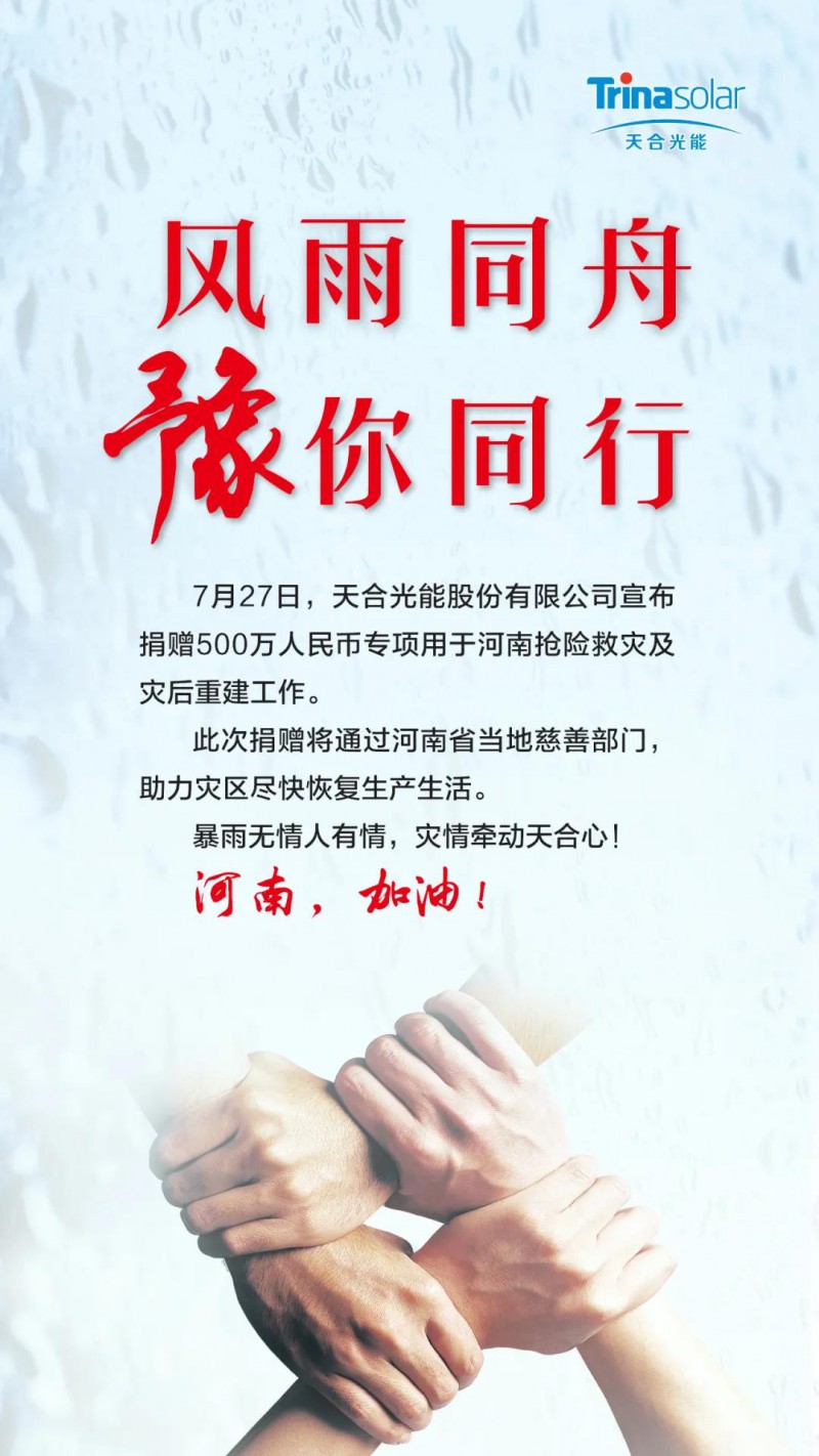 7月27日,天合光能股份有限公司宣布,捐贈500萬人民幣專項用于河南搶險救災(zāi)及災(zāi)后重建工作,此次捐贈將通過河南省當(dāng)?shù)卮壬撇块T,助力災(zāi)區(qū)盡快恢復(fù)生產(chǎn)生活。