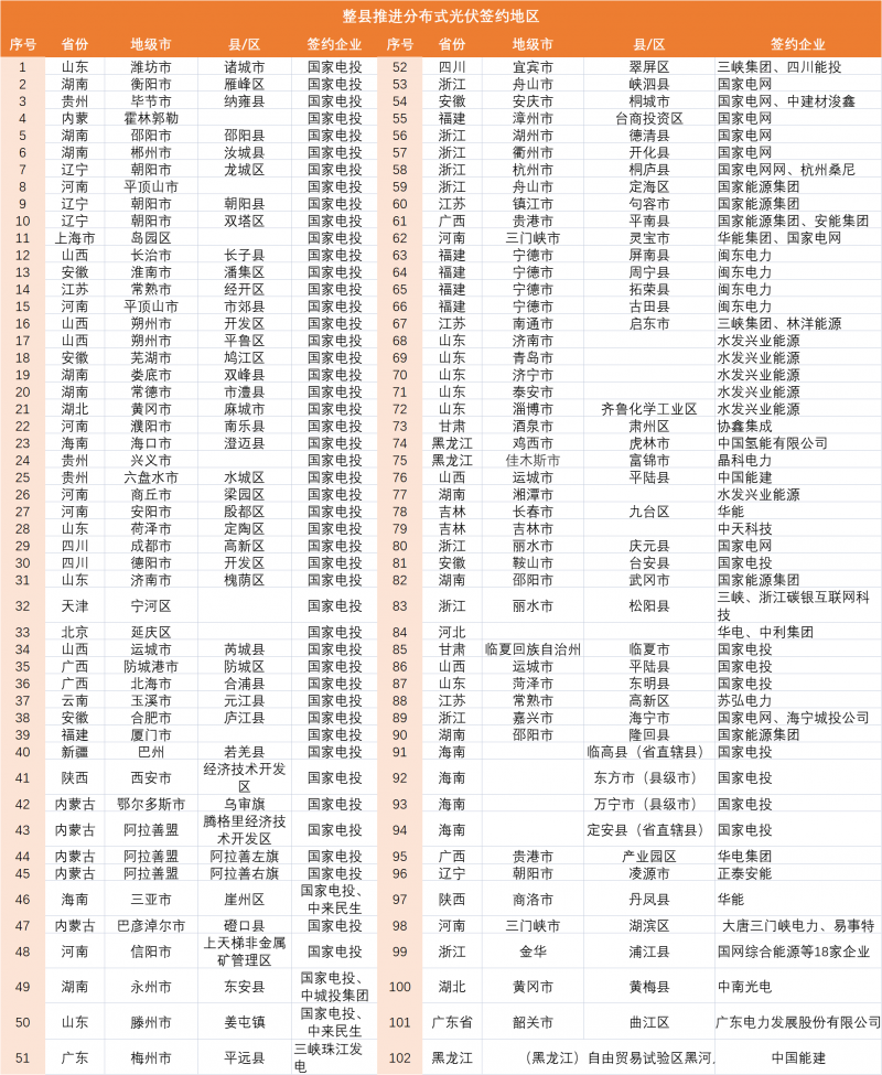從目前統(tǒng)計(jì)的簽約情況可以發(fā)現(xiàn),已經(jīng)有102個(gè)縣市區(qū)與企業(yè)簽約或者啟動(dòng)整縣推進(jìn)工作。其中仍以央國(guó)企為主,但也不乏深入?yún)⑴c其中的民營(yíng)光伏企業(yè)。隨著分布式光伏整縣推進(jìn)的落地,這或?qū)⒊蔀橹袊?guó)分布式光伏市場(chǎng)一個(gè)劃時(shí)代的起點(diǎn)。