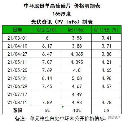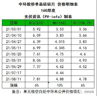 同日,中環(huán)股份公布了170μm、165μm、160μm三種厚度的硅片價(jià)格。以170厚度為例,與上次公開數(shù)據(jù)相比,166硅片上漲0.44元,漲幅達(dá)10%;210硅片上漲0.44元,漲幅為6%,158.75硅片上漲0.26元,漲幅為6%。本次價(jià)格自今日開始施行。
