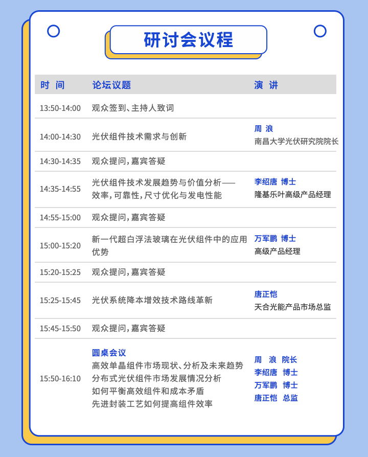 針對(duì)線下熱門的光伏組件相關(guān)專題,除嘉賓們的演講主題之外,本次大會(huì)特別增加圓桌會(huì)議形式,將會(huì)針對(duì)觀眾提出的各個(gè)問題逐一進(jìn)行討論交流。