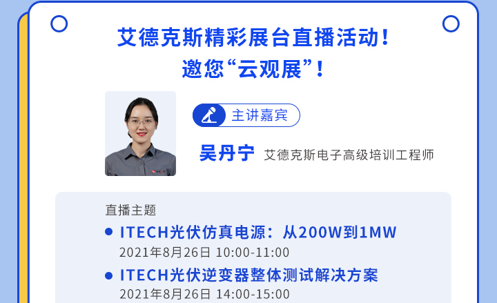 同日,維科網(wǎng)光伏還將為您帶來艾德克斯精彩展臺(tái)直播活動(dòng)!誠摯邀請(qǐng)您“云觀展”!敬請(qǐng)期待!
