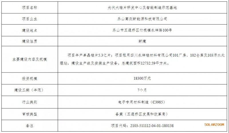 據(jù)了解,光伏大硅片研發(fā)中心及智能制造示范基地項(xiàng)目業(yè)主為樂山高測新能源科技有限公司,項(xiàng)目位于樂山市五通橋區(qū)竹根鎮(zhèn)永祥路100號。該項(xiàng)目年產(chǎn)單晶硅片5.3億片;項(xiàng)目租用四川永祥硅材料有限公司101廠房、102倉庫及103污水處理站,建設(shè)生產(chǎn)線及安裝生產(chǎn)設(shè)備??偨ㄖ娣e12732.59平方米。該投資規(guī)模為18300萬元,建設(shè)工期為7個月。