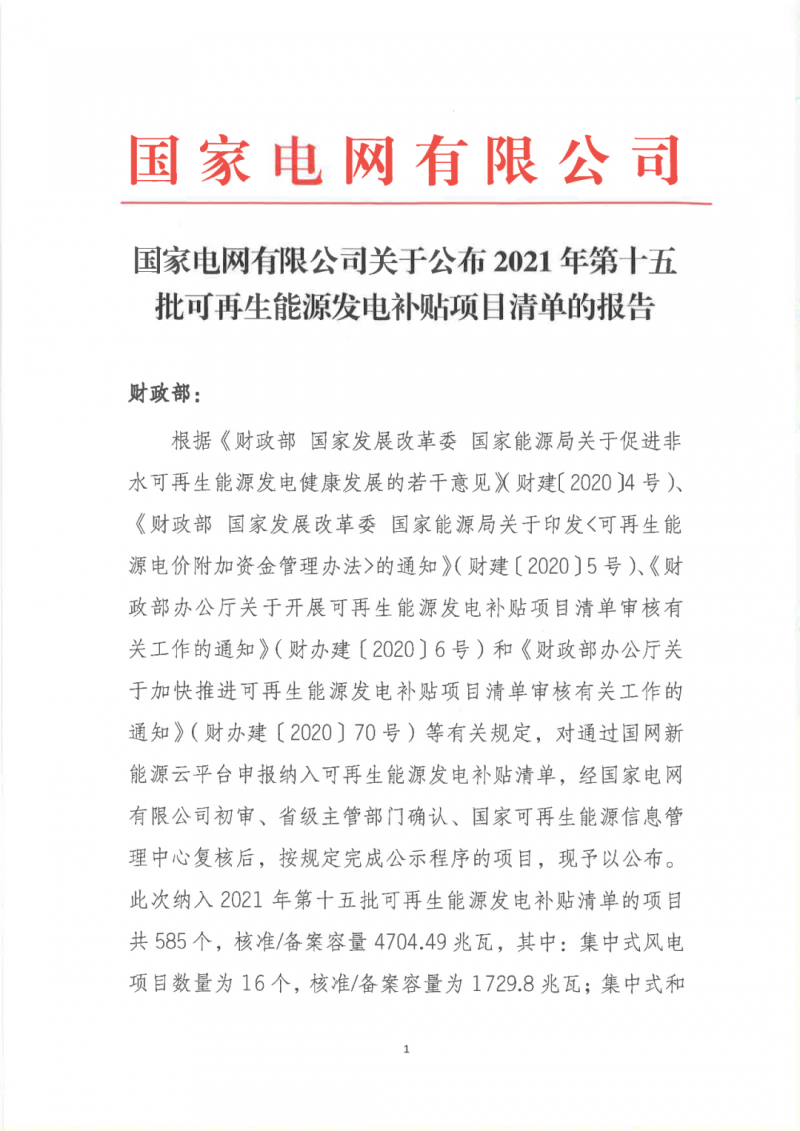 2021年8月15日,我公司已將完成公示的2021年第十五批可再生能源發(fā)電項目補貼項目清單上報國家主管部門,第十五批項目清單及后續(xù)項目審核進展情況,請登錄新能源云平臺查詢。