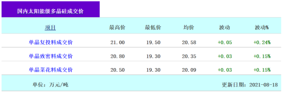 本周多晶硅價格基本穩(wěn)定,散單成交價漲幅在1元/kg左右,對產(chǎn)業(yè)鏈成本的影響不大。硅業(yè)分會介紹,絕大多數(shù)硅料企業(yè)訂單基本已簽至8月底甚至9月上旬,本周新簽訂單多為散單和補單。此外,下游訂單需求較為穩(wěn)定,傳導至上游,可以支撐硅片環(huán)節(jié)開工率提升,價格也有所回升,硅料需求持續(xù)向好。