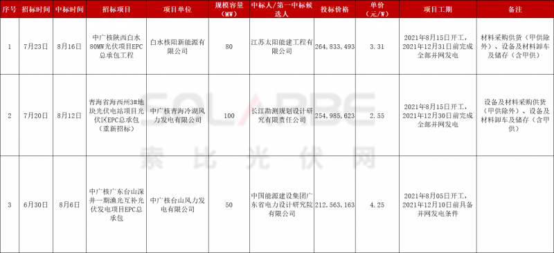 其中,中廣核陜西白水80MW光伏項(xiàng)目EPC總承包工程、青海省海西州3#地塊光伏電站項(xiàng)目光伏區(qū)EPC總承包(重新招標(biāo))兩個小EPC中標(biāo)價(jià)格為2.55元/W、3.31元/W,第一中標(biāo)候選人為江蘇太陽能建工程有限公司、長江勘測規(guī)劃設(shè)計(jì)研究有限責(zé)任公司。材料采購供貨、設(shè)備及材料卸車及儲存均含甲供。