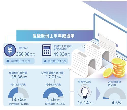 日前,隆基綠能科技股份有限公司公布了上半年成績單:實現(xiàn)營業(yè)收入350.98億元,同比增長74.26%;實現(xiàn)歸屬于上市公司股東凈利潤49.93億元,同比增長21.3%。這些利好信息,推動半年報公布當日的隆基股份股價探高接近百元,總市值一度超過5000億元。